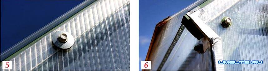 11. Прикрутил листы поликарбоната, располагая их встык и фиксируя между собой специальными соединительными планками. В качестве крепежа использовал саморезы с термошайбами для герметичности мест соединения. Торцы и край ската крыши оклеил армированным алюминиевым скотчем, придавая жесткость и исключая образование конденсата в листах (фото 5-7).