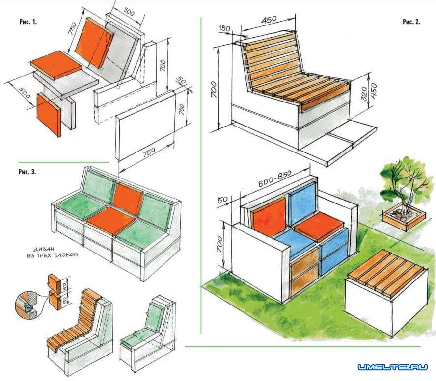 Мебель можно снабдить подлокотниками для более комфортного отдыха. (рис. 1) Для этого достаточно установить по бокам вертикальные основания из бетонных плит. При сборке различных частей мебели образующиеся внутри свободные полости можно заполнить монтажной пеной.