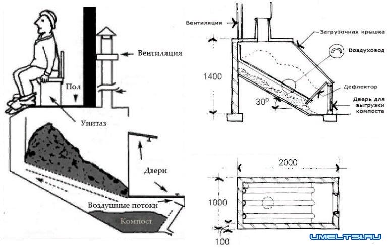 Человек сидит на стульчаке, его отходы попадают в специальную емкость с торфом, расположенную внизу. В качестве тары можно использовать бак-выварку, металлическое ведро или другую подходящую для этого дела тару. После того как человек сделал свое дело, поверх отходов насыпается порция торфяной смеси. Садоводы, к примеру, к торфу добавляют опилки. Делается это в пропорциях один к одному.