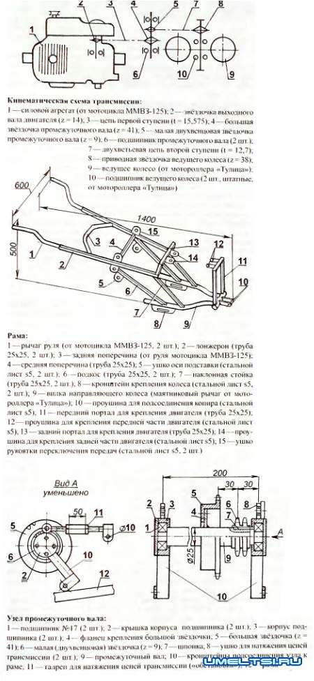 Здесь же отмечу, что крепление промежуточного вала на раме получилось довольно замысловатым, поскольку надо было исключить касание цепей трансмиссии о детали рамы и одновременно обеспечить возможность перемещения промежуточного вала с целью их натяжения при необходимости. Поэтому в статье хотя и привожу чертёж промежуточного вала (он-то нареканий не вызывает), вариант его крепления на раме представляю только как руководство к действию Может быть, кто из решивших сделать подобную конструкцию найдёт более простое решение!