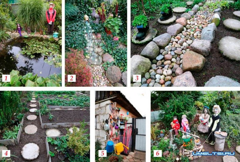 Так как я очень люблю украшать садовый участок, в нем не осталось ни одного свободного уголка, куда бы я не поселила игрушечных обитателей. Прямо в огороде устроила «пикник» для целого деревянного семейства. Фигуры смастерила из березовых поленьев, лица нарисовала, а вместо глаз прикрутила пластиковые крышки. Руки и ноги сформировала, напихав в старые колготки разную ветошь. Усадила семейку вокруг импровизированного костра. На тарелочке выложила хлеб и сало, которые изготовила из поролоновых губок для мытья посуды и покрасила акриловыми красками (фото 6).