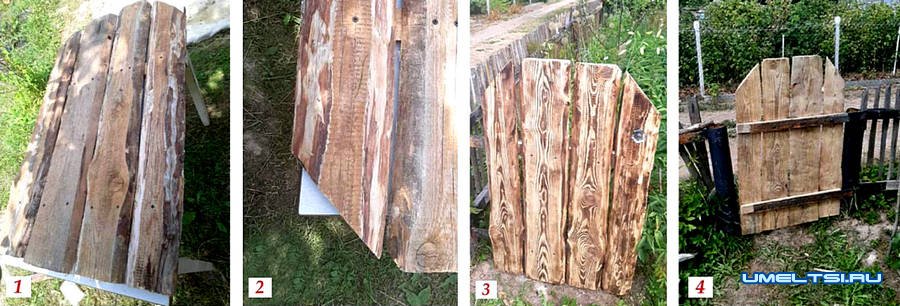 Всю деревянную поверхность обработала с помощью болгарки с чашечной насадкой с металлической щеткой. Затем обожгла поверхность со всех сторон газовой горелкой на баллоне. Повторила зачистку древесины щеткой. Получился красивый рисунок. Просверлила дрелью отверстие под пластиковую ручку, которую сняла со старой межкомнатной двери. Установила калитку в проем на петли (фото 3, 4).