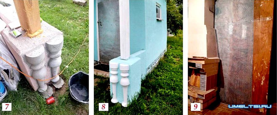 Для украшения крыльца использовала бетонные полубалясины, которые отдал мне знакомый из-за ненадобности. Они были выше выступа, поэтому отрезала их до нужной высоты болгаркой с диском по бетону. Развела плиточный клей и зафиксировала на него декоративные элементы (фото 7). Покрасила фасад дома краской мятного цвета, а балясины и столб выделила белым (фото 8).