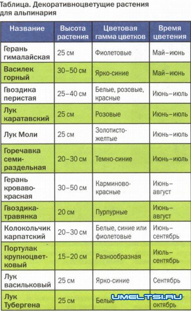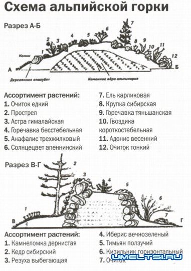 Возле почвопокровных хорошо будут расти карликовые луковичные. Эти растения цветут первыми. После них на альпийской горке зацветут аубриетта, армерия, колокольчик, крупка, горечавка, морисия, камнеломка, алиссум, гвоздика и др. Прекрасным украшением альпийских горок являются декоративные низкорослые травы. Среди них трясунка (бриза) большая, трясунка средняя и малая, отличающиеся только высотой куста. Все они неприхотливы, холодостойки, способны расти на любых почвах, даже не слишком плодородных. Лагурус (зайцехвост) — травянистое растение с пушистыми колосками, напоминающими заячий хвост. Хорошо растет как на солнце, так и в полутени. Растение холодостойкое и влаголюбивое. На склоне альпийской горки высаживайте почвопокровные растения: очиток, седум, морисию, крупку и др. Некоторые многолетние травы, например иберис, ясколки, тимьян, очиток - своего рода агрессоры, поэтому надо следить, чтобы они не заполонили -чужую территорию», и периодически их прореживать.
