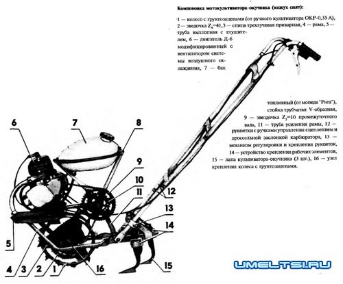 Управление сцеплением и дроссельной заслонкой карбюратора заимствованы от мотоцикла, тросы — от мотороллера. Для обеспечения высоких удобств (в использовании) за ручкой сцепления в поручне просверлено сквозное отверстие о 4 мм, в какую вставлена скоба фиксации рычага в отжатом состоянии (при старте мотора). А реализация ручек съемными дают возможность быстро ставить мотокультиватор в багажник автомобиля либо в коляску мотоцикла.