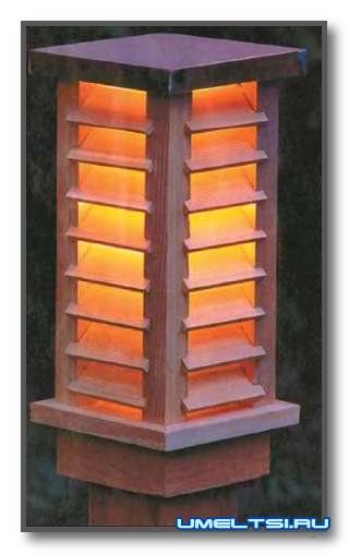 Затем в торце стойки сечением 100x100 мм сверлят отверстие 25x50 мм и вставляют в него трубку. Чтобы спрятать проводку, на менее бросающейся в глаза стороне стойки фрезеруют паз. Для прокладки проводки из паза в трубу сверлят отверстие 9 мм. Через него и трубу пропускают провод, подключают лампу и надевают рассеиватель. В заключение, ввернув через основание один шуруп, крепят рассеиватель к стойке.