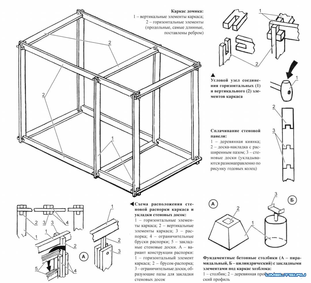 Для такого упрощенного домика возможно применение и упрощенного фундамента любого типа. Однако лучше всего -столбчатый, с использованием, например, асбоцементных труб, располагаемых под вертикальными элементами каркаса. Но, поскольку масса домика относительно небольшая, то для противодействия опрокидыванию от ветровой нагрузки каркас должен быть надежно соединен с фундаментом. Для этого в бетонные опоры могут быть вмонтированы предварительно деревянные пробки, к которым каркас крепится глухарями. Или же использована металлическая арматура: швеллеры, уголки подходящего сечения.