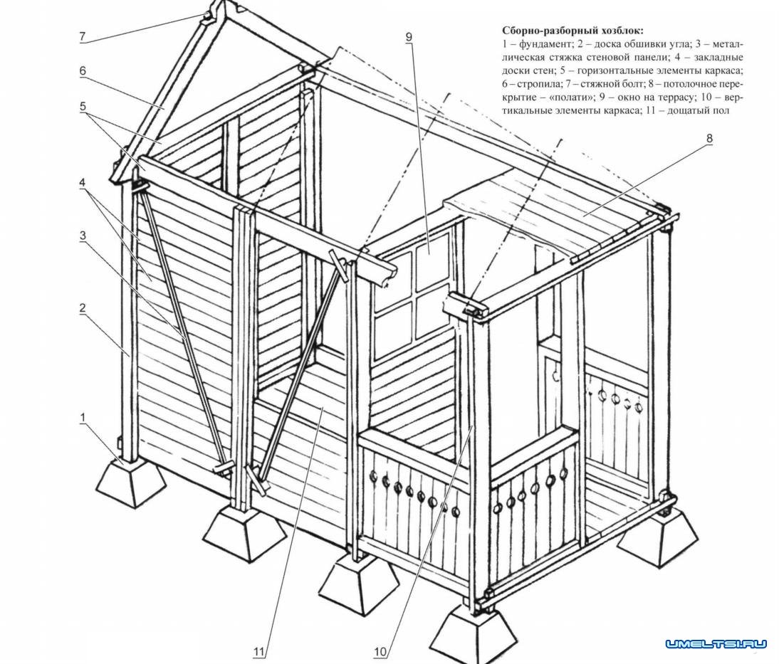 Освоение загородного участка, садового или огородного, начинается, как правило, с возведения на нем временной постройки - хозблока. В нем можно с минимальными удобствами отдохнуть или переночевать, укрыться от непогоды и хранить инструменты. Такие сборно-разборные домики продаются в виде готовых наборов, но гораздо чаще в целях экономии их сколачивают по месту, получая в результате довольно убогие сооружения, которые после завершения основного строительства сносятся или они разваливаются сами.