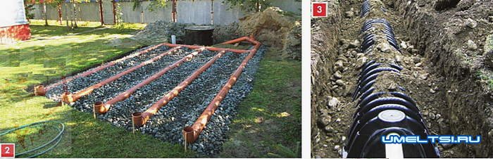 ■ Поля подземной фильтрации. Представляют собой сеть подающих и оросительных труб диаметром 100 мм, уложенных на глубине 0,5-1,8 м (зависит от глубины промерзания грунта) от поверхности земли до верха труб. Под трубы укладывают щебень или гравий слоем 20 см. Те же материалы насыпают сверху слоем 5-10 см, закрывают их геотекстильной мембраной (предотвращает попадание грунта в щебень) и засыпают грунтом.