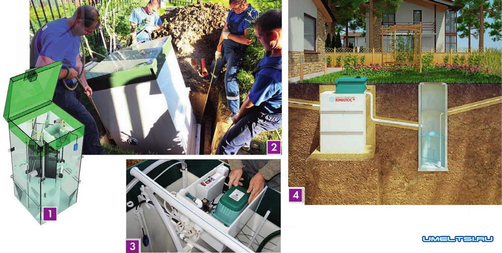 Станция глубокой биологической очистки представляет собой аккуратный герметичный моноблок. Внутренняя «начинка» состоит из приемной емкости с фильтром, отсеивающим крупные нечистоты, основной секции принудительного снабжения кислородом (подается с помощью компрессора) и вторичного отстойника. Очищенная вода уходит в землю через дренажные канавы или колодцы. Последние делают из обычных железобетонных колец и устанавливают на некотором удалении от моноблока. В зависимости от модели аэра-ционной установки выброс очищенной воды в ливневую канаву или дренажный колодец осуществляется принудительно либо самотеком.
