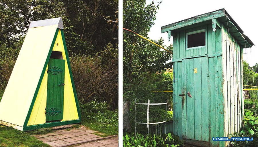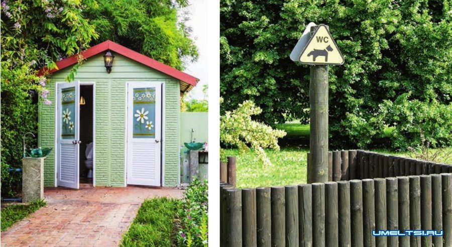 Модифицированная версия «домика». Наклонные стены и низко посаженная крыша создают необычную бочкообразную форму. Расширения по бокам позволят спокойно разместить в туалете рукомойник, вешалку и дополнительные полочки. Конструкция может оказаться не совсем простой для мастера-люби-теля, но она прочна, устойчива и с честью выдержит любые погодные невзгоды. Форма сказочной избушки пользуется сегодня большой популярностью, ведь она позволяет экспериментировать с дизайном и эффектно вписывать необычное строение в ландшафт.
