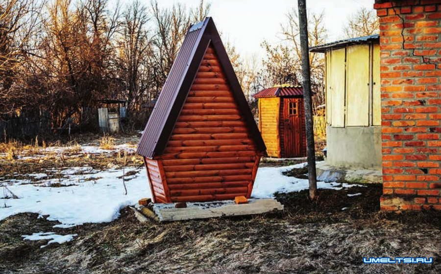 Кабинка в виде шалаша отличается простотой постройки и экономичностью — ведь крыша здесь одновременно выполняет функцию стен.