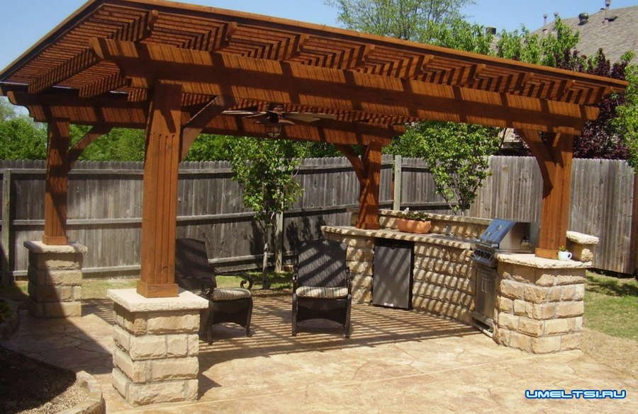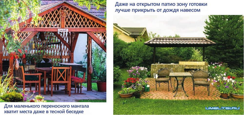 Беседки дают ощущение домашнего уюта, но отдалены от дома, поэтому предъявляют меньше требований к пожарной безопасности. Приспособить старую беседку под барбекю не удастся, если она была построена достаточно компактной и все пространство в помещении занимают стол и лавки, между которыми оставлены узкие проходы, едва достаточные для того, чтобы протиснуться и занять место за столом. Такие небольшие шести- или восьмигранные беседки в обилии встречаются на старых дачных участках. Если это ваш вариант, то барбекю можно приставить тыльной стороной к одной из внешних стенок, выбрав место, где никто не сидит. Главное, позаботиться о безопасном расстоянии от деревянных деталей и термо-изолировать деревянные стенки.