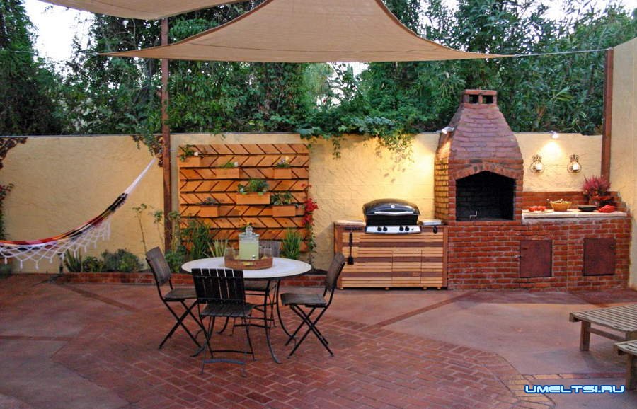 Для установки печи-барбекю на патио термоизоляция не нужна, зато потребуется защита от ветра и дождя, а также твердое основание под ногами. Площадку можно расположить в саду, на удалении от дома, или построить в непосредственной близости от него - как продолжение террасы. В этом случае обычно строится примыкающая к фасаду дома пергола, увитая зеленью и дающая защиту от солнца, либо надежно предохраняющий от дождя навес. Как вариант - патио с барбекю можно построить возле старой и не очень просторной беседки, площадь которой не позволяет разместить в ней печь. Материалы для мощения могут быть любыми, укладка - как сплошной, так и с разреженными швами между элементами, которые засеваются травкой.