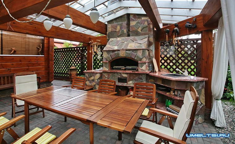 Лучшее место для обустройства полноценной летней кухни с печью - это крытая терраса или открытая веранда. Они являются связующим элементом между домом и садом, поэтому совмещают преимущества готовки на свежем воздухе с домашним комфортом. В этом случае удобно будет пользоваться кухней и санузлом, не составит труда подвести воду и электричество. Здесь можно разместить все необходимое, даже холодильник. Навес не только защищает нас и нашу кухню от непогоды, но и дает возможность установить потолочные светильники-споты для освещения рабочей зоны. В такой кухне-столовой можно готовить не только днем, но и вечером.