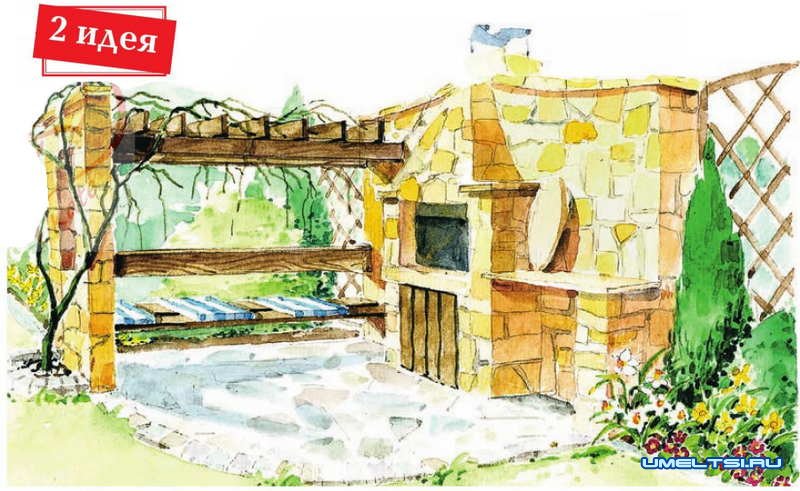 В данной композиции высокий трельяж и деревянная пергола полностью изолируют летнюю кухню от садового участка. Он играет роль основного противовеса в массивной конструкции каменного гриля. Вся конструкция опирается на каменную стенку, в которой оставлено маленькое окошко. Площадка перед стационарным каменным грилем занимает небольшую поверхность. Часть ее находится в тени перголы.