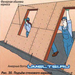 Подъём каркаса стены. С двумя помощниками (два человека — по концам стены и один — посредине) поднимите стену до пояса (рис. 30). Затем, удерживая каркас немного наклонённым, подвиньте его к краю фундаментной плиты так, чтобы внутренняя кромка нижней обвязки совместилось с меловой линией. Анкерные болты должны быть напротив просверленных в нижней обвязке отверстий.