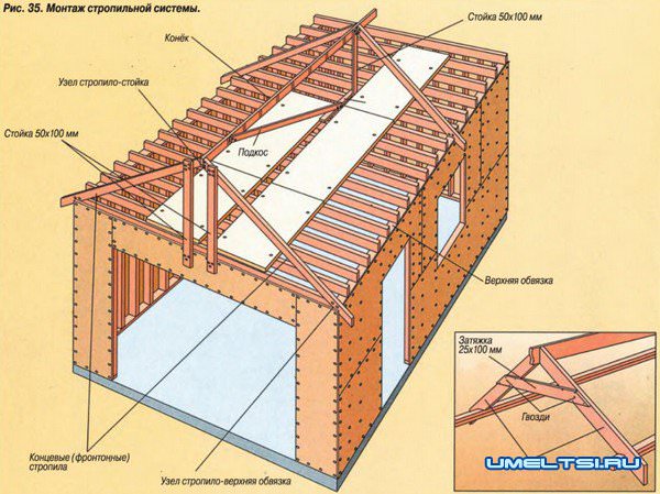 Разметив и выпилив пары стропил, подготовив стойки и коньковую доску, приступают к монтажу стропильной системы. По потолочным балкам настилают доски или листы фанеры в качестве рабочей площадки. Первыми монтируют фронтонные пары стропил со вставками вместо коньковой доски. Их крепят к верхней обвязке и фронтонным стойкам. Затем вместо вставок устанавливают коньковую доску и остальные стропила.