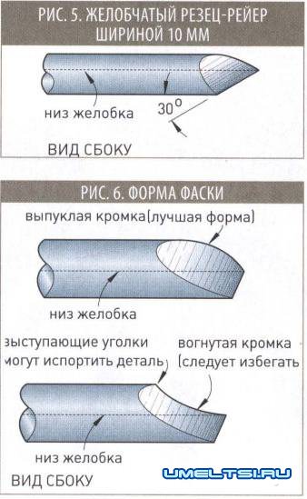 Эти резцы поступают в продажу с различными вариациями заточки. В некоторых случаях такая заточка работает неплохо, но чаще приходится полностью перетачивать резец. Боковая заточка таких резцов с удлиненной режущей кромкой и меньшей вероятностью врезания в деталь становится все более популярной. (При боковой заточке фаска простирается дальше от кончика вдоль краев клинка в противоположность прямой заточке, как у обдирочного рейера.) Из-за большого количества движений, которые непросто описать доходчиво, такая заточка требует большой практики, и не каждый сможет выполнить ее вручную. К счастью, универсальная насадка-держатель приспособления Wolverine Jig позволяет делать это, даже не имея опыта.