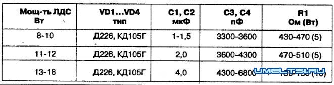 Оставшуюся лампу с поврежденной спиралью тоже можно использовать. Я, например, заменил в садовых светильниках лампы накаливания на лампы, сделанные из сгоревших ЭЛ. Для этого собрал стандартную схему бестрансформаторного умножителя напряжения, который в момент запуска создает на выводах лампы напряжения порядка 1000 В (рис.2). В литературе данные по элементам этой схемы приведены для ЛЛ мощностью от 20 до 80 Вт. Чтобы адаптировать их к ЭЛ, имеющим мощность 8... 18 Вт, я составил таблицу. В схеме можно использовать как исправные, так и вышедшие из строя ЛЛ.