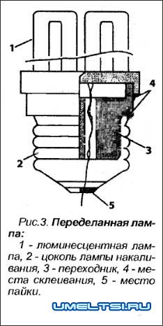 Частая причина выхода из строя ЭЛ - перегорание одной из спиралей, расположенных внутри трубки. При этом ЭБ остается неповрежденным, и его можно использовать для изготовления светильников в комбинации с любыми ЛЛ -трубками, кольцевыми, U-образными (рис. 1). Светильник получается экономичным и негудящим, поскольку отсутствует традиционный для ЛЛ дроссель.