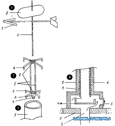 Желательно сделать и флюгер (рис.1), на котором установлен козырёк (2) для повышения тяги и защиты трубы от прямого попадания дождя и снега. Можете на самый верх «посадить» красивого петуха. Для флюгера потребуется сварка. Из рисунков должно быть понятно, но вкратце поясню.