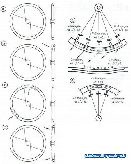 а - обод без деформаций; б - «восьмёрка» (часть обода уходит за плоскость вращения); в - «яйцо» (обод не круглый - часть его вогнута или выпукла, или то и другое); г - «зонт» (середина обода смещена относительно середины втулки, обычно это результат неправильной сборки колеса)