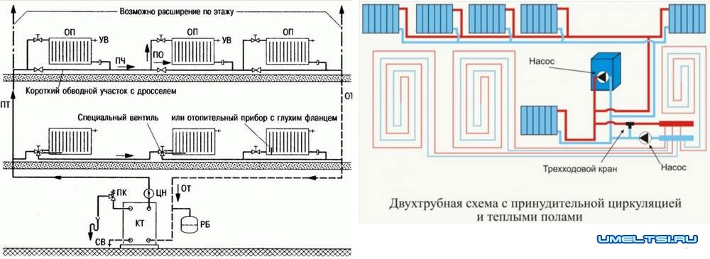 • двухтрубной, где задействованы две трубы – одна направлена на подачу тепла, другая – на возвращение.