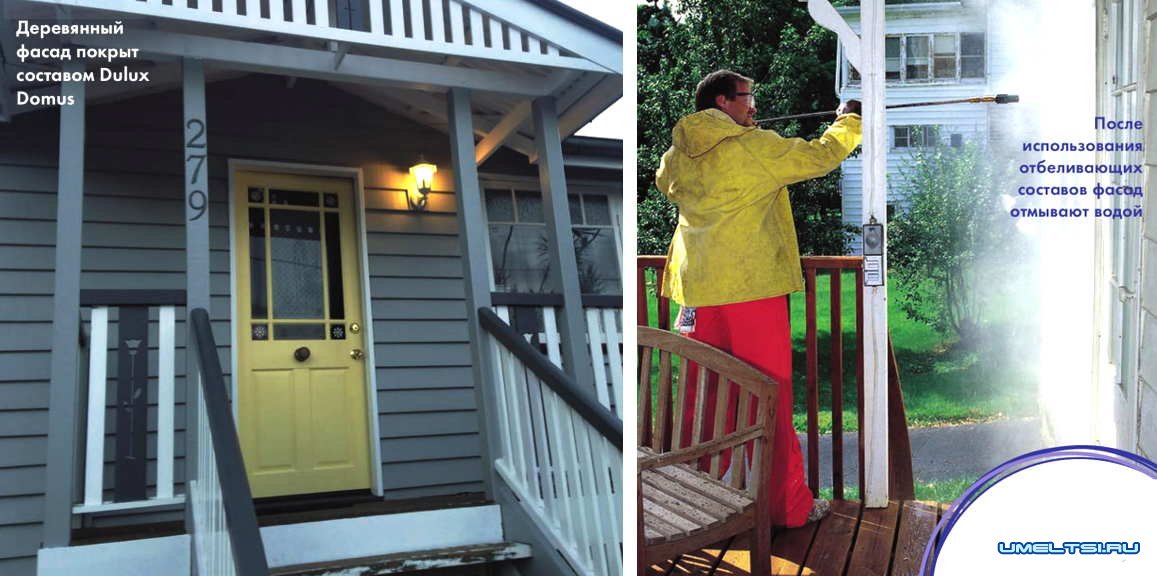 Если посерел или посинел только что построенный деревянный дом, то бывает до слез обидно закрашивать стены «глухой» краской - раз и навсегда. В подобных случаях стоит попытаться отбелить древесину, применив состав двойного действия. Если вы решились на столь смелый шаг, приготовьтесь к сложной процедуре защиты от воздействия химически агрессивных продуктов. Сначала надо спланировать работы: решить, как обезопасить газон и деревья, куда отвести воду, использованную для мытья выбеленных стен, приобрести «непробиваемую» спецодежду, резиновые перчатки, маску. Инструкцию следует перечитать несколько раз. Лучше все-таки использовать отбеливатели, содержащие активный кислород, хотя, как утверждают знатоки, хлор обладает бесподобной убойной силой. Концентрированный состав разводят в указанных на упаковке пропорциях и несколько раз наносят на серые стены. Через некоторое время фасады отмывают обильным количеством воды. Когда беленькая, чистая и здоровая древесина хорошенько высохнет, стены грунтуют, а затем наносят тонированный или кроющий антисептик.
