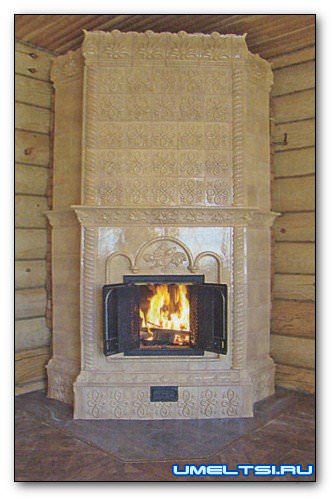 Дизайн. Дом был построен из шлифованных брёвен, покрытых защитным слоем специального лака. От этого дом казался аккуратным сказочным теремком, что и подсказало идею отделки печи в традиционном русском стиле. Изначально этот стиль предполагал ручную роспись на изразцах, но местоположение каминопечи в комнате относительно окна определило несколько иное направление работы. Главную роль в дизайне печи решено было отдать рельефному рисунку на изразцах, и полученный результат показал правильность этого выбора. Особенно хорошо это видно при дневном освещении, когда свет падает сбоку и рельефный рисунок отлично проявляется на поверхностях печи, создавая впечатление лёгкости конструкции. При вечернем же освещении, равномерном и более рассеянном, главную роль играет цвет изразцов, максимально приближенный к цвету натурального, «живого» дерева.