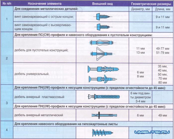 Для сборки облицовочных конструкций и устройства перегородок из гипсокартона применяются два вида крепежных элементов. Элементы для крепления ГКЛ к каркасу из профилей. В этом случае применяются два вида шурупов (саморезов):