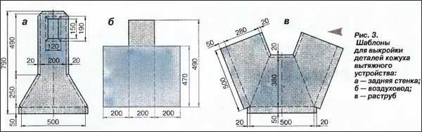 Уяснив для себя, какой раструб и воздуховод требуются в конкретном случае, следует нарисовать в выбранном масштабе две его проекции относительно плиты (рис. 2). Чтобы правильно изобразить детали вытяжного устройства необходимо произвести ряд геометрических построений. Подробно на них останавливаться не буду — приведу лишь чертежи шаблонов для раскроя заготовок из листа металла (рис. За,б,в). По этим чертежам целесообразно предварительно изготовить макет раструба в масштабе 1:10 или 1 5 из тонкого картона или ватмана. Кстати, это здорово поможет потом при работе с листом металла — на макете удобно отрабатывать последовательность резов и сгибов.