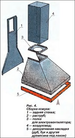 Готовые детали вентиляционного устройства (рис. 4) крепят винтами с потайными (коническими) головками и гайками МЗ. Полку для электровентилятора внутри воздуховода лучше всего крепить теми же винтами, которые соединяют раструб с воздуховодом.