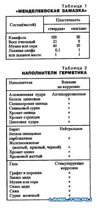 Состав «менделеевской замазки» достаточно прост (таблица 1). Варьируя соотношением канифоли, воска и олифы, можно получать герметик различной пластичности.
