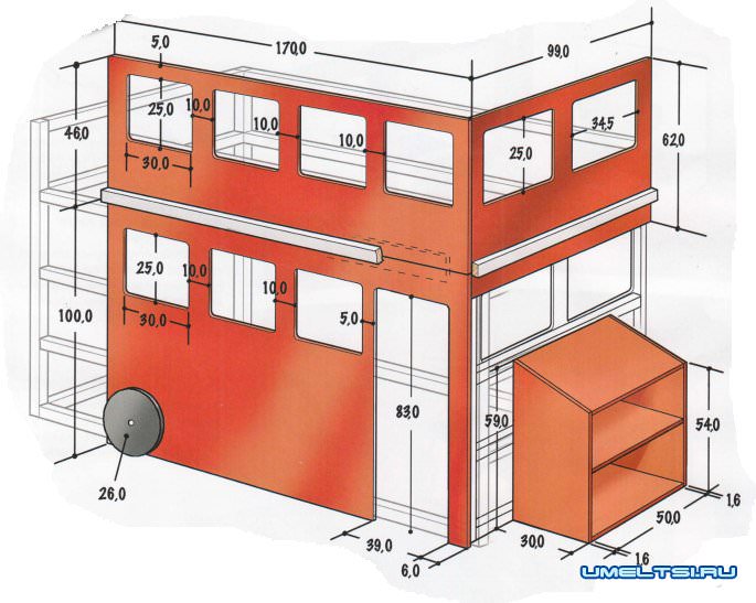 Источником вдохновения для модели нашей двухъярусной кровати стали старые лондонские двухэтажные автобусы. Единственное, мы отказались от выступа над кабиной водителя, благодаря чему этот проект легко и быстро можно осуществить самому. Наш автобус предназначен для детей от трех до семи лет. Когда через несколько лет увлечение автобусами ослабеет, эту модель можно быстро превратить в простую двухэтажную кровать.