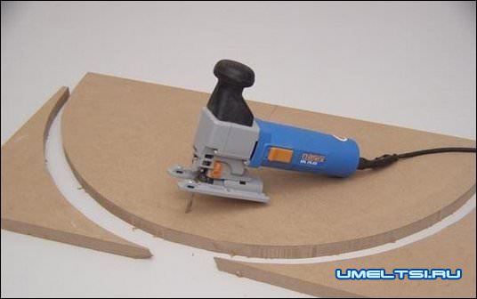 I. Доску вырезаем размером 400х800 мм. Толщиной лист должен быть 20-25 мм. По длинному краю стола отмеряем полоску. Ширина полоски 60 мм. Для придания очертания стола разметку выполняем следующим методом. Маленьким шурупом-саморезом крепим планку, или верёвку в средине стола, проводим по радиусу, намечаем круг.