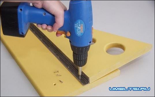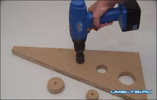 VI. Сверлим в треугольных деталях разного диаметра отверстия. Места сверления отверстий намечаем от длинной стороны на 70мм. Сверление выполняем при помощи дрели и различных насадок.