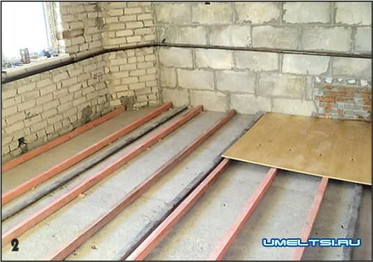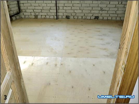 2. Крепим фанеру ясное дело шурупами. Под поперечные края листов фанеры для крепления дополнительно подлаживаем бруски перпендикулярно лагам.