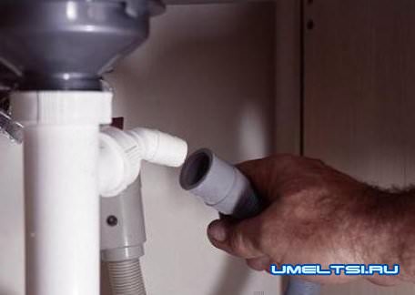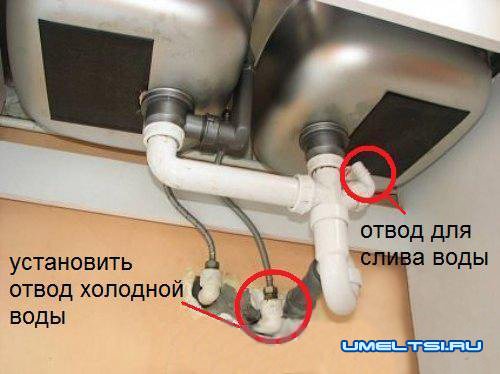 Прежде всего, надо перекрыть водоснабжение. Как правило, когда нужно подключить смеситель на кухонную мойку, пользуются различными гибкими шлангами. Соответственно, надо откручивать шланг, убрать его. После этого к трубе привинчивается такое приспособление, как тройник, на который и будет накручиваться шланг, идущий от смесителя.