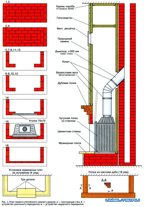 Первые четыре ряда кладки - основание камина, на которое приходится вся нагрузка и от чугунной топки, и от всех расположенных выше элементов конструкции камина. Поэтому кладку основания сделали сплошной, без забутовки или засыпки. Начиная с 5-го и по 13-й ряд выложили нишу для чугунной топки. По окончании кладки стенок ниши установили топку на своё место - на выровненный и выверенный по уровню 4-й ряд кладки основания. На 14-м ряду установили стальной уголок 70 х 70 мм для перекрытия портала, который 15-м и 16-м рядами перекрыли кирпичом «на ребро».