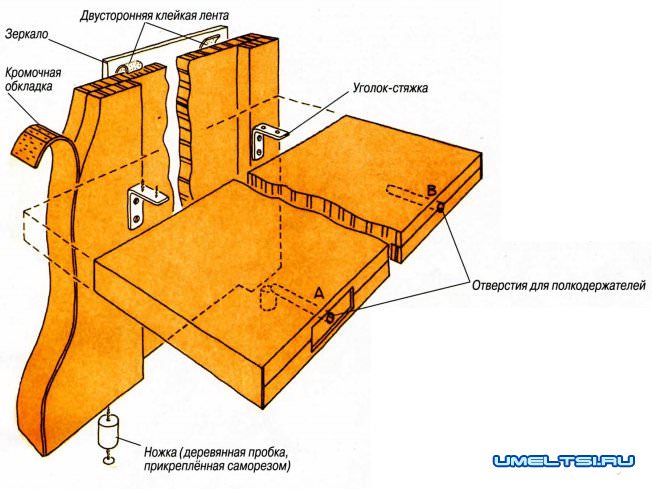 Рис. 1. Все открытые кромки фасадной плиты и полок облицовывают мебельной обкладкой. Зеркало крепят двусторонней клейкой лентой.