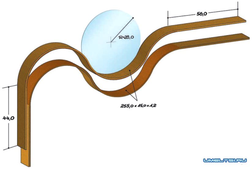 На первый взгляд конструкция изогнутой полки покажется сложной, однако попробовать стоит. По этому принципу можно в дальнейшем создавать вещи самых причудливых форм. Волнообразная полка изготовлена по технологии «сэндвич» из двух полос плиты МДФ толщиной 12 мм.