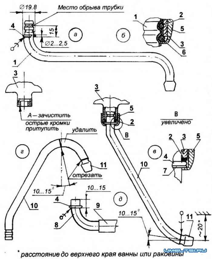 Чтобы вода при полном напоре не вытекала за ванну, наконечник должен быть наклонен вниз на 10 — 15е и располагаться ниже ее края на 10 — 20 мм.