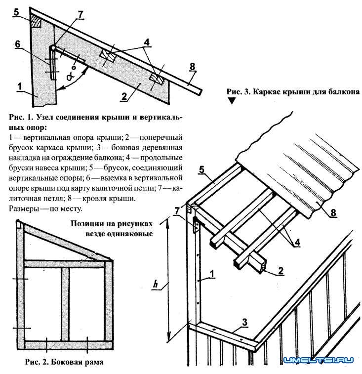 Такое решение даёт возможность собрать крышу отдельно, а потом поднять её на петлях и опереть на переднюю раму, которая также собирается отдельно и устанавливается на ограждении балкона при подъёме крыши.