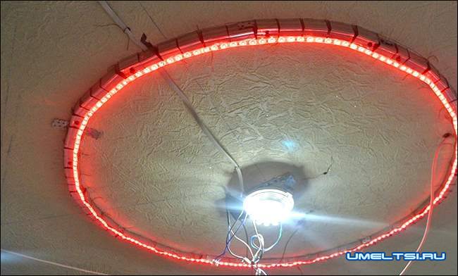 Для декоративной подсветки в металлопрофиль вставили неоновую ленту. Которая также будет под полотном.