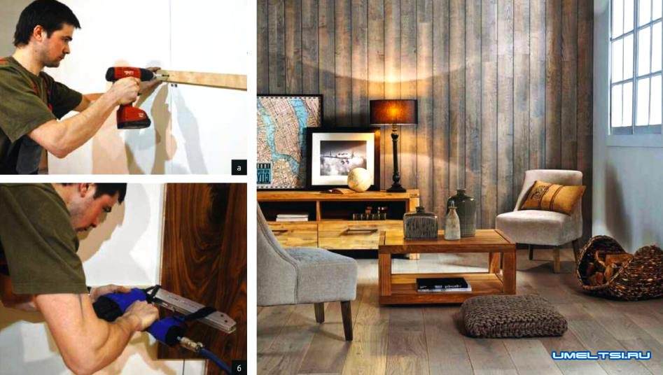 Чтобы стена смотрелась более гармонично, желательно вскрыть несколько упаковок, разложить элементы на полу, подбирая их по цвету и фактуре. Ведь дерево — природный материал, и встретить планки с одинаковым рисунком и цветом невозможно. Монтируют паркетные доски на любое ровное основание: оштукатуренное, из гипсокартона и т. д. Главное, выбрать соответствующий способ фиксации и придерживаться технологии процесса. Доверить это можно любому мастеру, знакомому с настилом паркетной доски на пол.