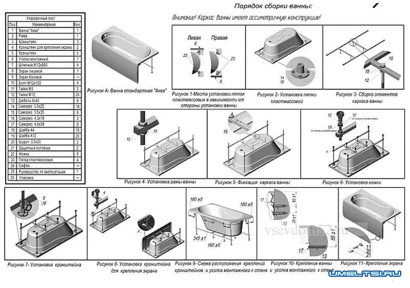 Поскольку установка акриловой ванны – процесс не самый сложный, его можно легко и быстро проделать собственноручно, без использования профессиональной помощи. Для того, чтобы акриловые модели было удобнее собирать, их еще с завода комплектуют металлическим каркасом с регулируемыми ножками. Это делается для того, чтобы можно было установить ванную на нужную покупателю высоту. В обычный состав комплекта для сборки каркаса входят: металлический профиль, имеющий разную длину, а также готовые отверстия для крепления; подпятники, ножки, гайки, саморезы и стойки.