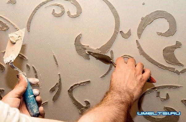 8. Для создания рельефа используют ту же декоративную шпатлёвку, которую наносили для декорирования всей поверхности стены. Сначала шпатлёвку наносят на участки, где больше всего мелких деталей, чтобы зафиксировать мелкие перемычки трафарета в толще материала.
