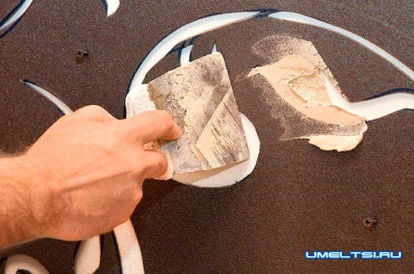 10. Когда все вырезы трафарета будут заполнены, излишки шпатлёвки удаляют сверху вниз и трафарет аккуратно снимают. Для полного высыхания шпатлёвки оставляют задекорированную поверхность на 2U часа. Если объёмный рисунок получился не очень аккуратным, то его линии можно скорректировать строительным ножом, после чего отшлифовать. Однако шлифовка не обязательна. Она необходима, как правило, в тех случаях, когда рисунок состоит из небольшого количества крупных элементов.