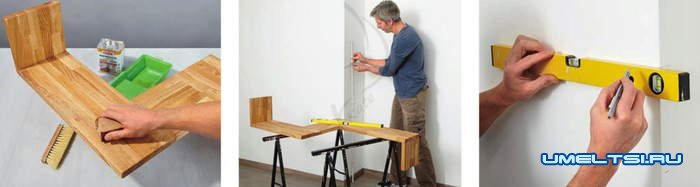 8. На отмеченной высоте горизонтально выровнять полку и сильно придавить ее к стене.